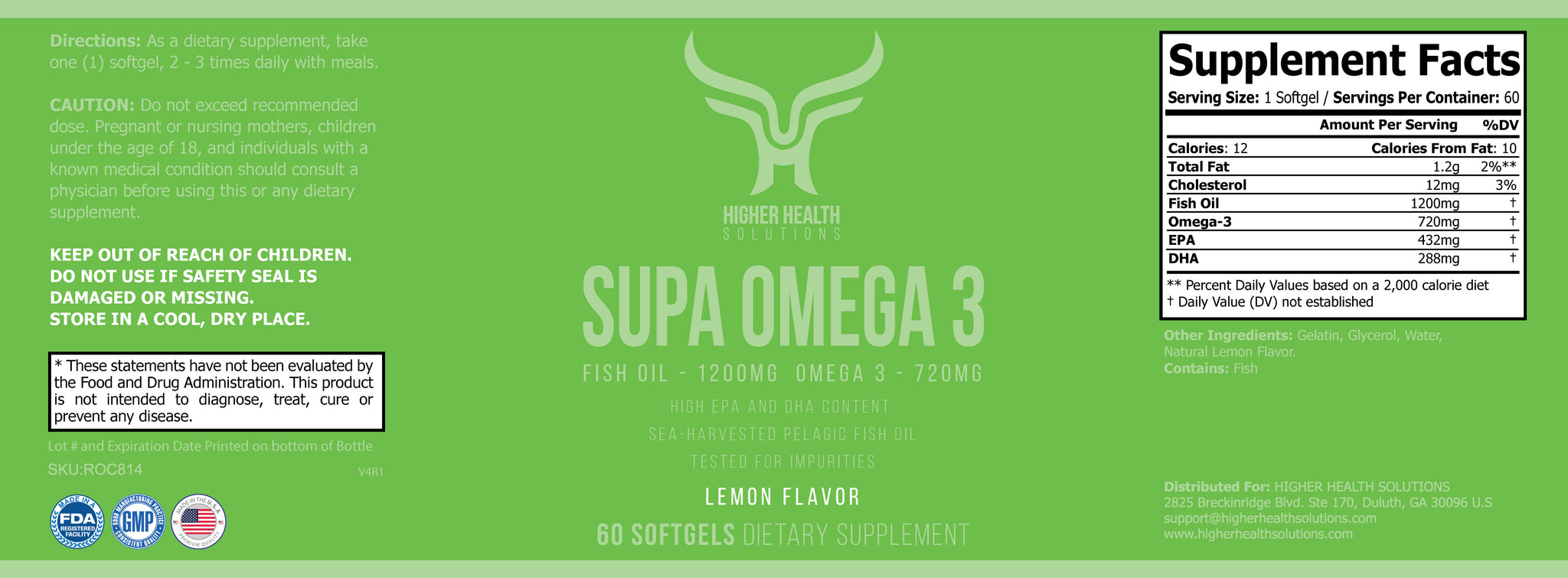 Supa Omega 3 Fish Oil provides your body with the healthy fats it needs to help joint flexibility while aiding your heart, brain, nerves and visual functions. Omega 3 Fish Oil uses only 100% pure sea-harvested pelagic fish oil, making this supplement high in EPA and DHA.*